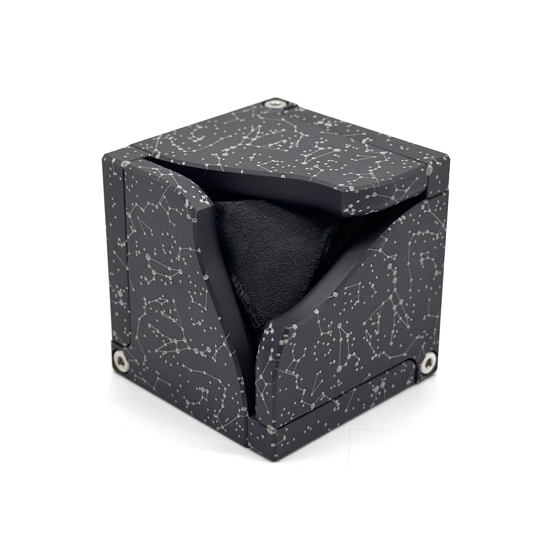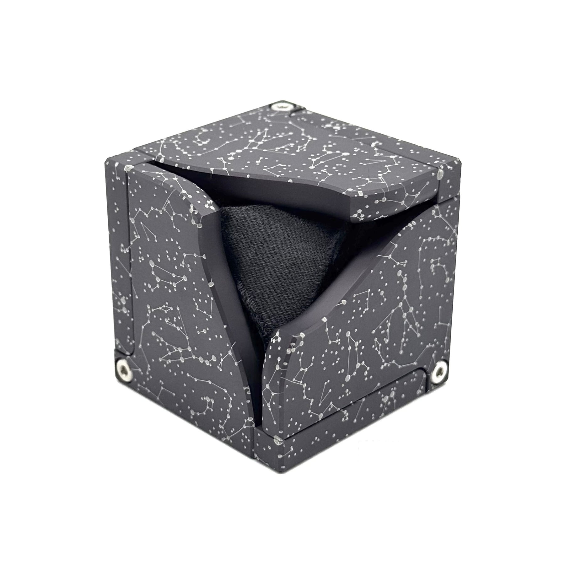 In the Kinetacube Ring Box's patented design, six faces of a cube are formed by the links of a mobius kaleidocycle mechanism. With each face mapped to an individual link, the entirety of the box transforms during the opening process, revealing its contents in one fluid motion. Its single degree of freedom movement results in motion which is fluid, satisfying, and will continue to mesmerize even years after introduction.