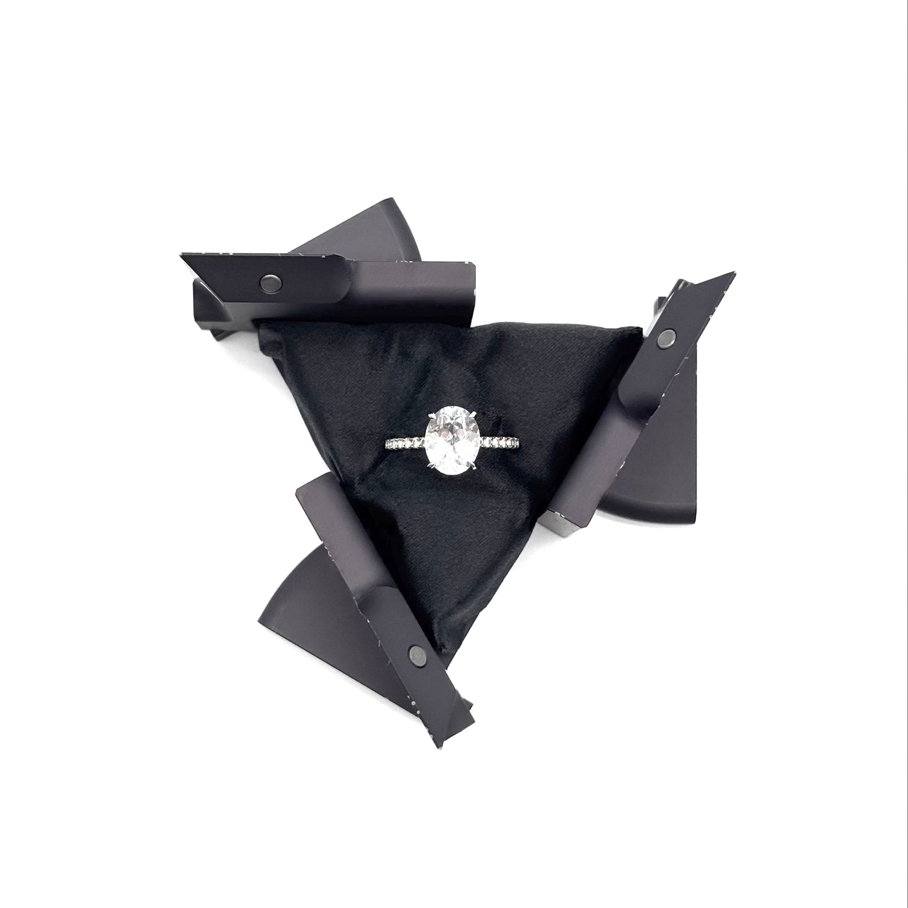 Inside of the ring box's machined aluminum mechanism, a silk-wrapped foam insert is installed to carry the box's contents. While closing, the insert's segmented design is wrapped around the ring, holding it securely in place. When opened, the foam insert flattens while continuing to grip safely onto the ring.